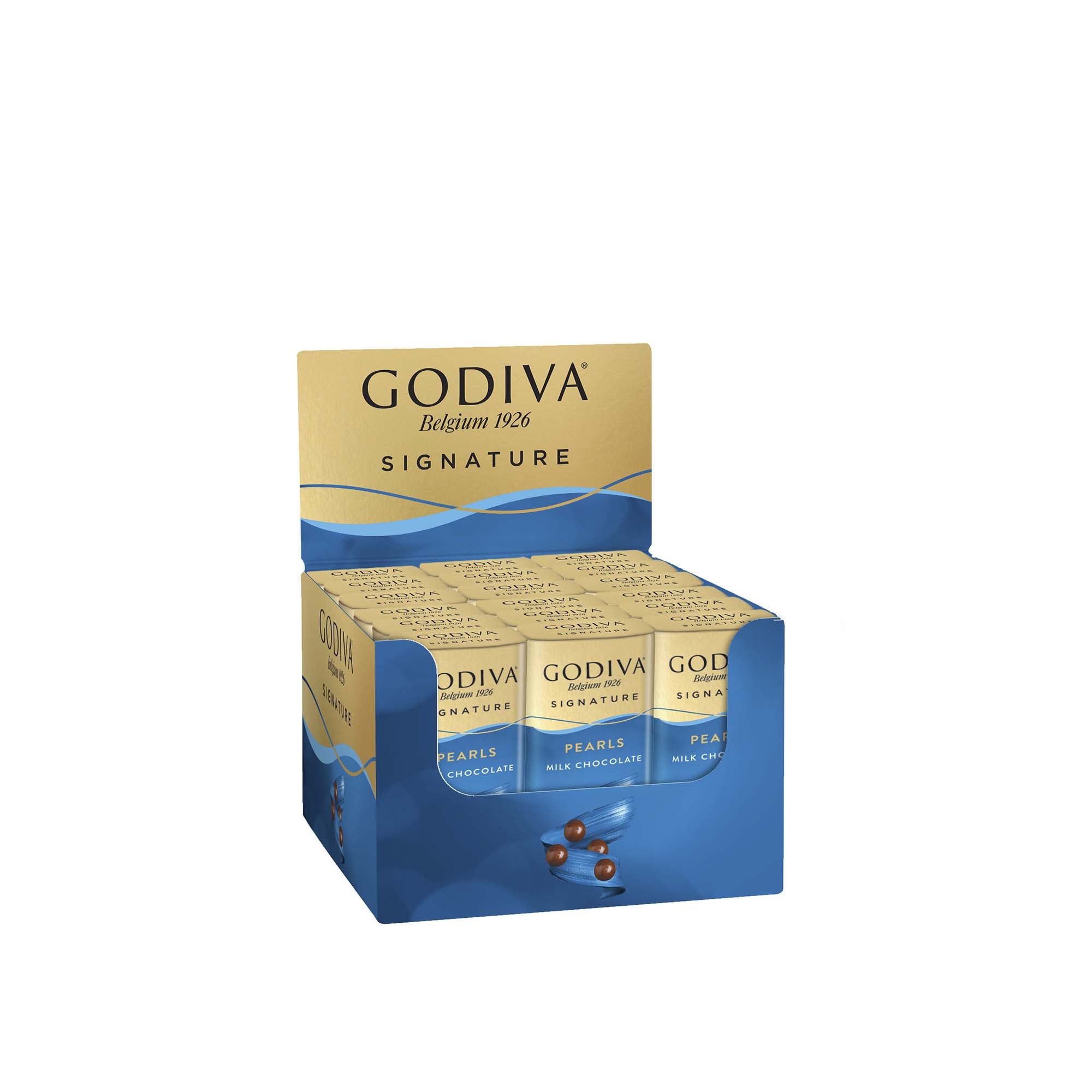 Godiva Milk Chocolate Pearls are little confections of chocolate perfection. The Pearls are packaged in take-me-with-you tins so that you never have to leave your Godiva far behind.
