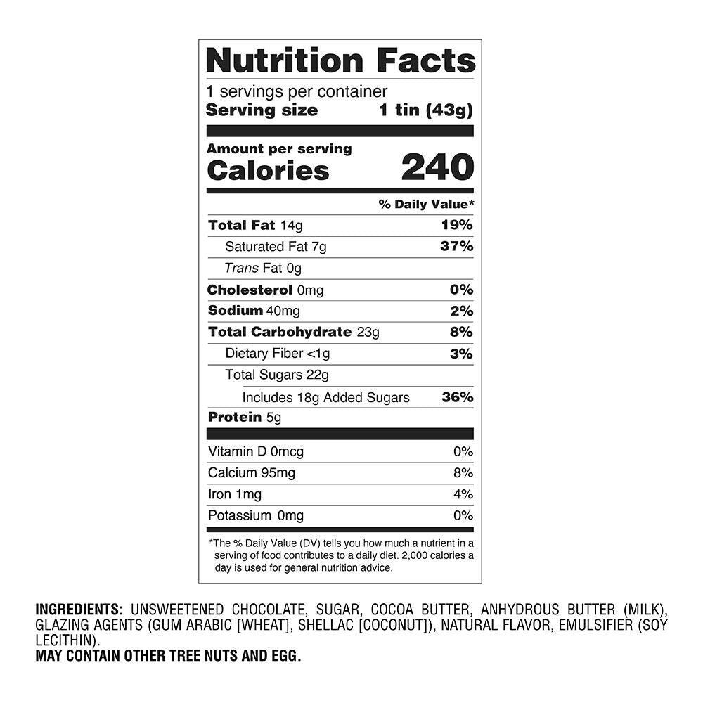 18 Individual Milk Chocolate Tins. Each tin measures 3.43″ x 1.7″ x 1.04″